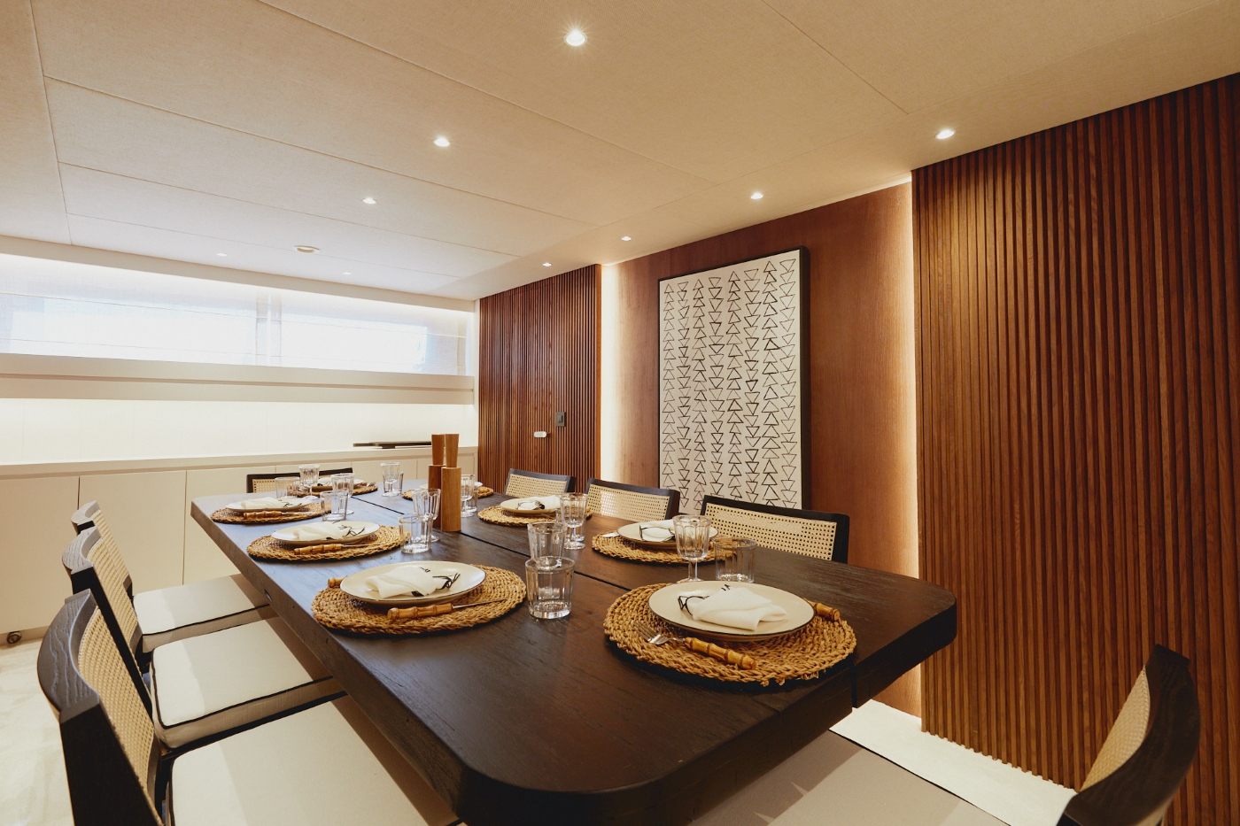 The main deck aft can accommodate everyone on board around the dining table making it the perfect spot to savour a leisurely al fresco dinner. There are steps down to the water’s edge swim platform from where the crew will launch the water toys.