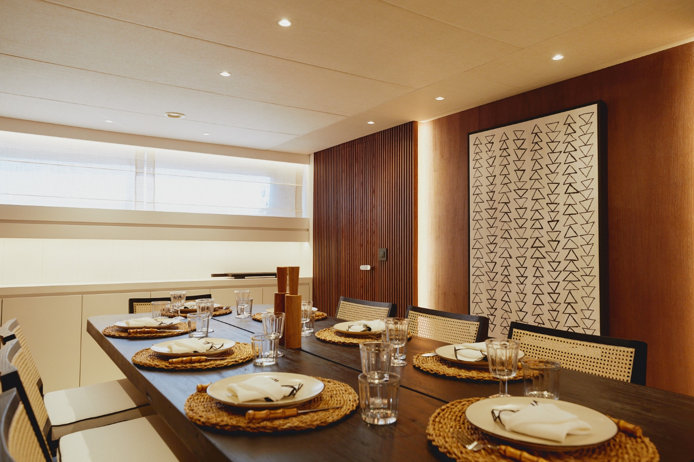 The main deck aft can accommodate everyone on board around the dining table making it the perfect spot to savour a leisurely al fresco dinner. There are steps down to the water’s edge swim platform from where the crew will launch the water toys.
