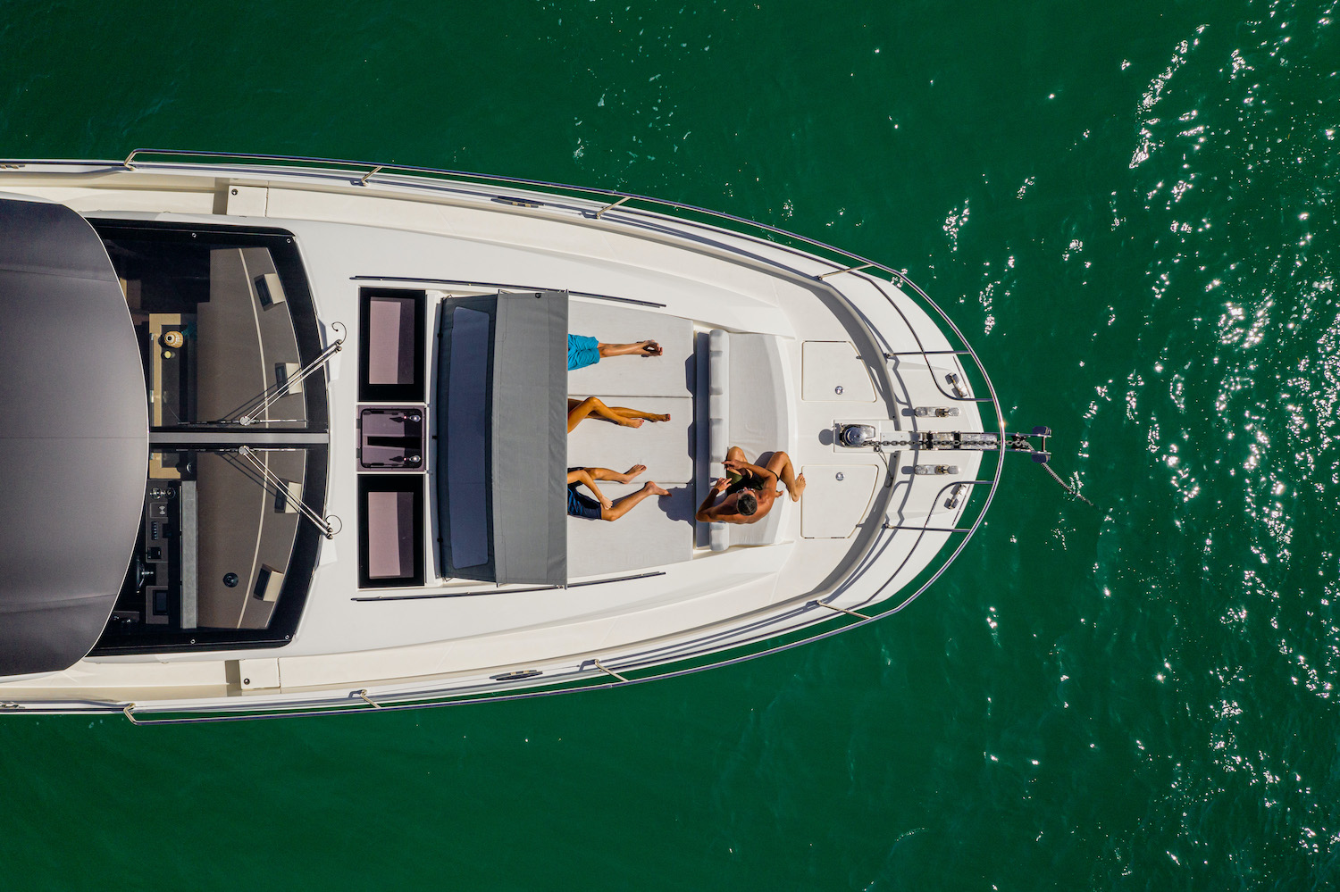 More sunbathing opportunities present on the foredeck where there is a wide row of sun pads with views out across the bow.