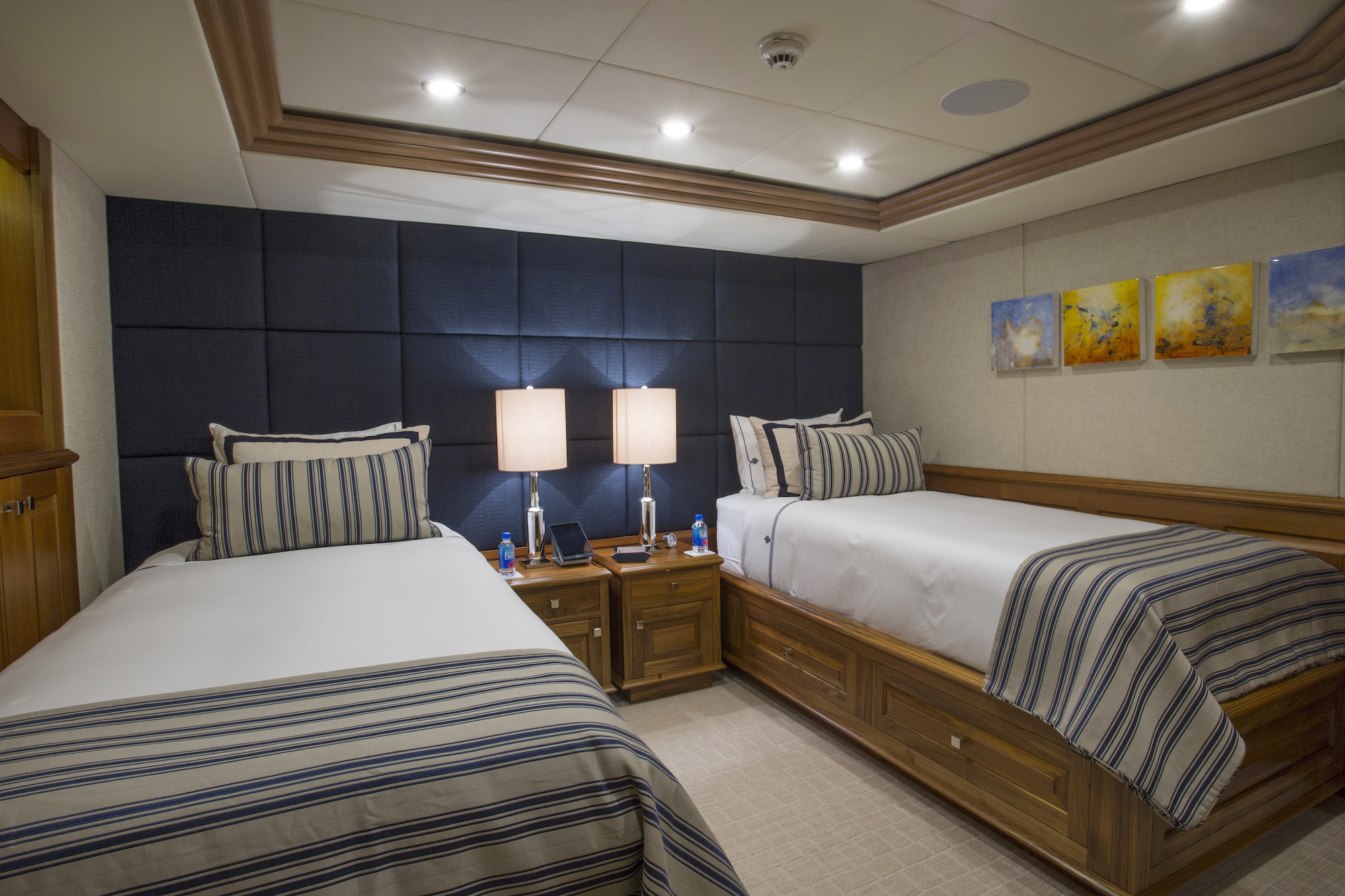 One double cabin also converts into a twin cabin. All of the staterooms have a flat screen Satellite TV with an IPOD docking station and Kaleidascape A/V. Tenders & Toys: