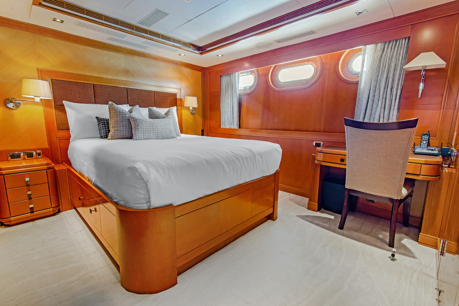 The fabulous main deck master suite offers primary charter guests a private haven with a separate office space, huge full beam bedroom and stunning forward ensuite bathroom with full bathtub.