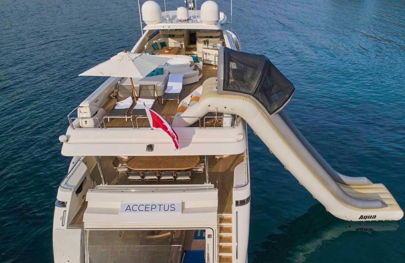 NOTABLE FEATURES OF ACCEPTUS: ~ Impressive leisure and entertainment facilities ~Pristine condition ~Deck jacuzzi ~At anchor and underway stabilisers ~Air conditioning ~WiFi