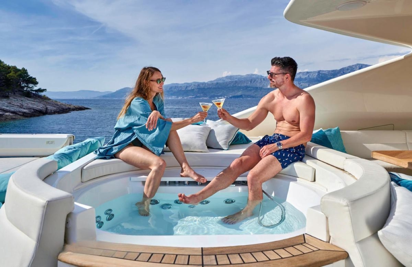 The sociable flybridge has a circular jacuzzi at its heart surrounded by a sweeping bench sofa which elegantly sweeps around the dining table.