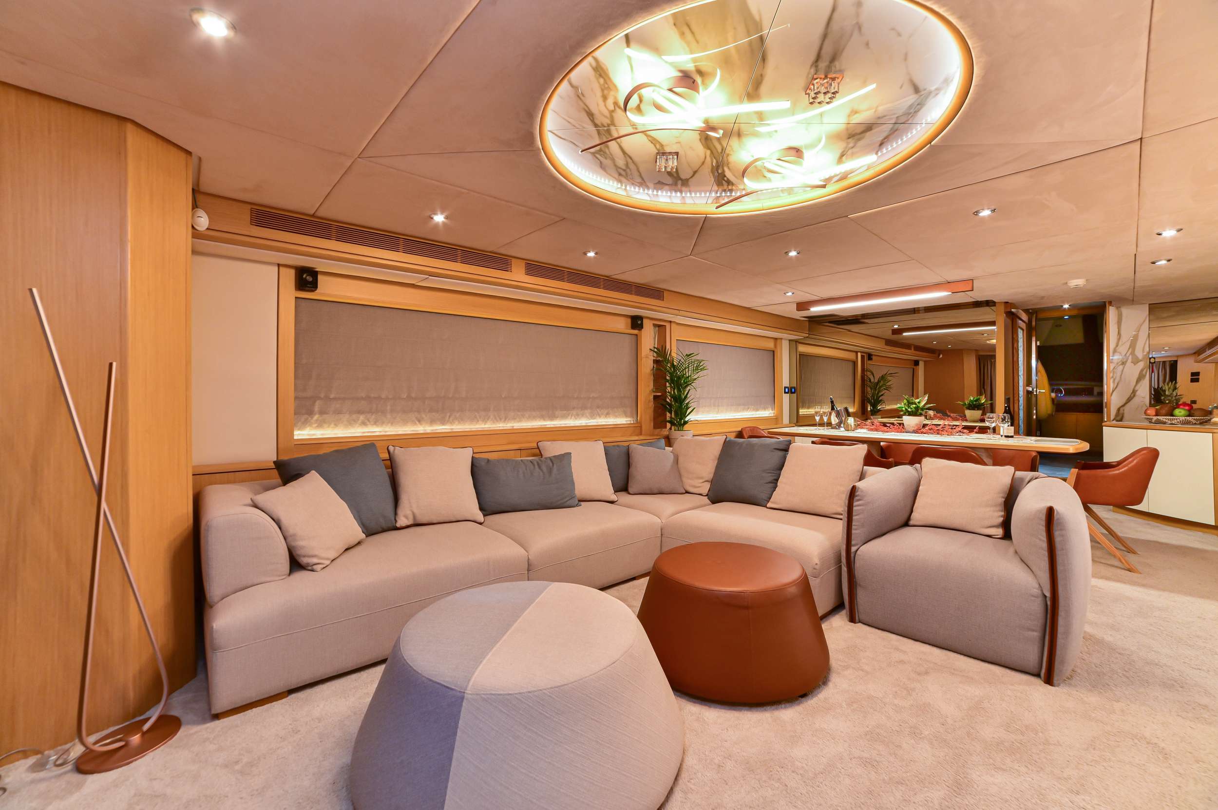 The warm and welcoming main salon is a stylish space with comfortable furnishings, plush carpet and panoramic windows. The lounge is situated aft and the dining room forward.