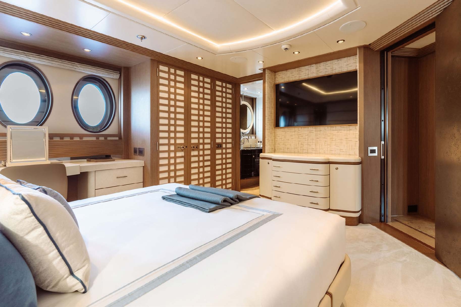 The additional accommodation is on the lower deck and configured as 1 VIP cabin with double bed and sofa area, walk-through dressing and ensuite, 1 double guest cabins with ensuite shower/bath room and 2 double/triple guest cabins with ensuite shower room. Both these cabins have a double bed (queen sized) and a single bed.