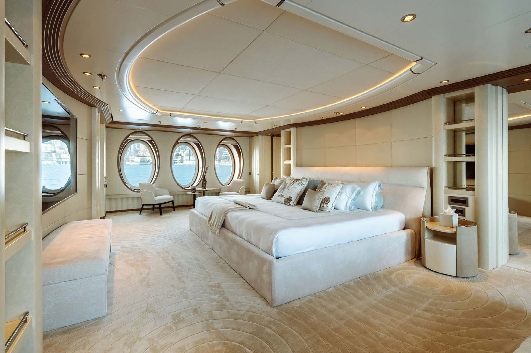The stunning master is full beam forward on the main deck and presents primary charter guests with a private haven.