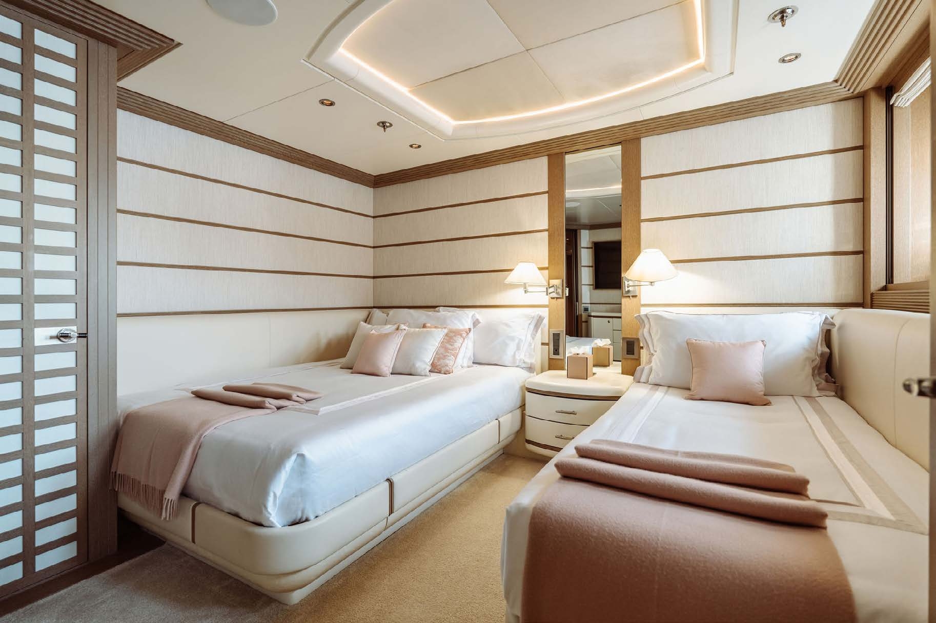 The additional accommodation is on the lower deck and configured as 1 VIP cabin with double bed and sofa area, walk-through dressing and ensuite, 1 double guest cabins with ensuite shower/bath room and 2 double/triple guest cabins with ensuite shower room. Both these cabins have a double bed (queen sized) and a single bed.
