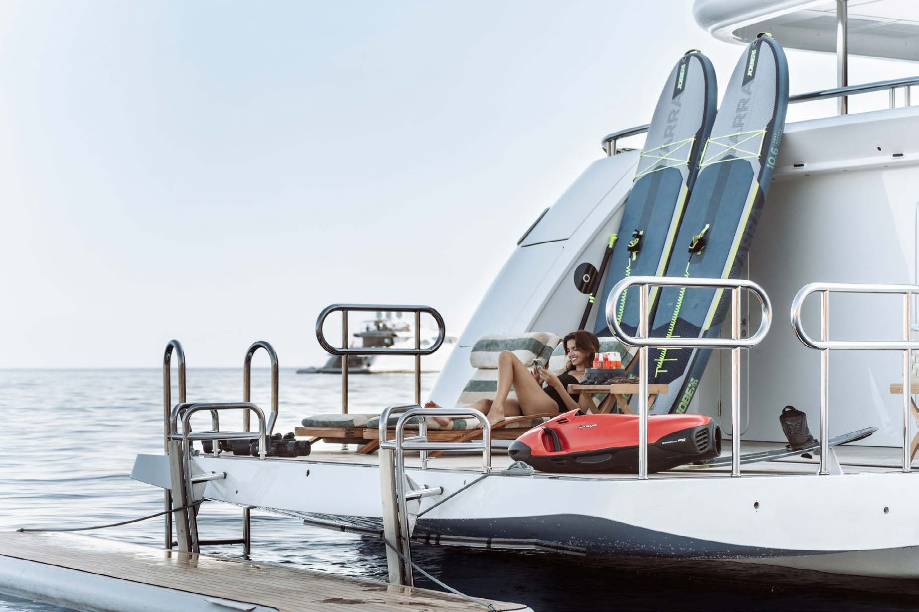 The main deck aft flows seamlessly into the main salon through huge glass doors and is the perfect spot for pre-dinner drinks or watching over fellow guests on the water toys. A large swim platform is created when the transom door is opened, and it is from here the crew will launch the collection of water toys.