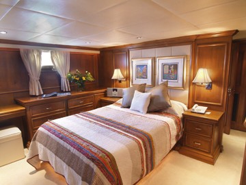 The yachts upper deck located off the Sky lounge is open but shaded with comfortable wicker seating for al fresco dining or cocktails. Her aft Deck is a large covered deck area with casual dining for 12. There is a twin stairway with access to the swim platform and gym and day head with shower.