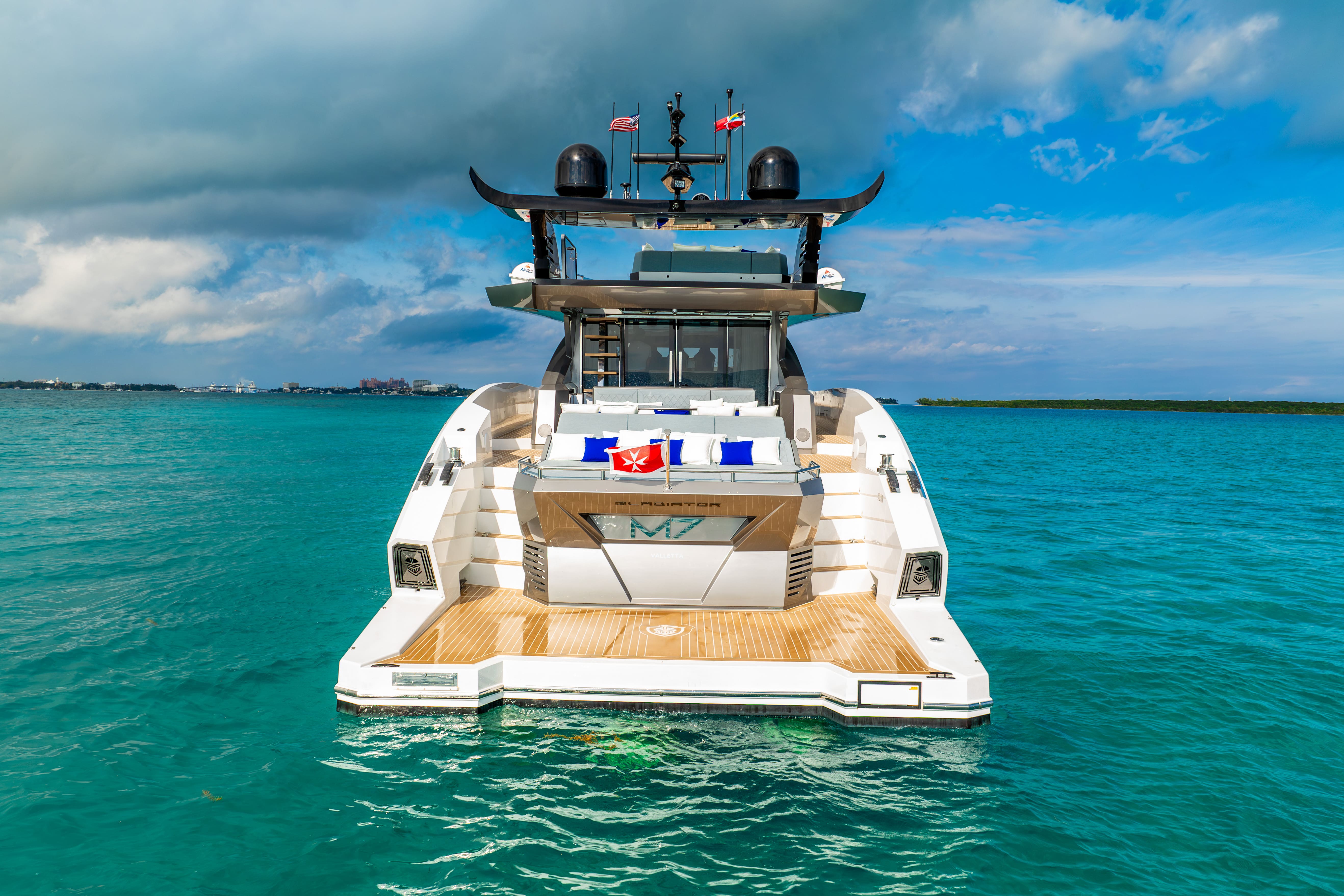 Starting on the aft deck guests will be in awe of the amazing aft-facing elevated sun padded platform which seems to float above the swim platform. In addition there is a table surrounded by 2 sofas perfect for al fresco dining or drinks.