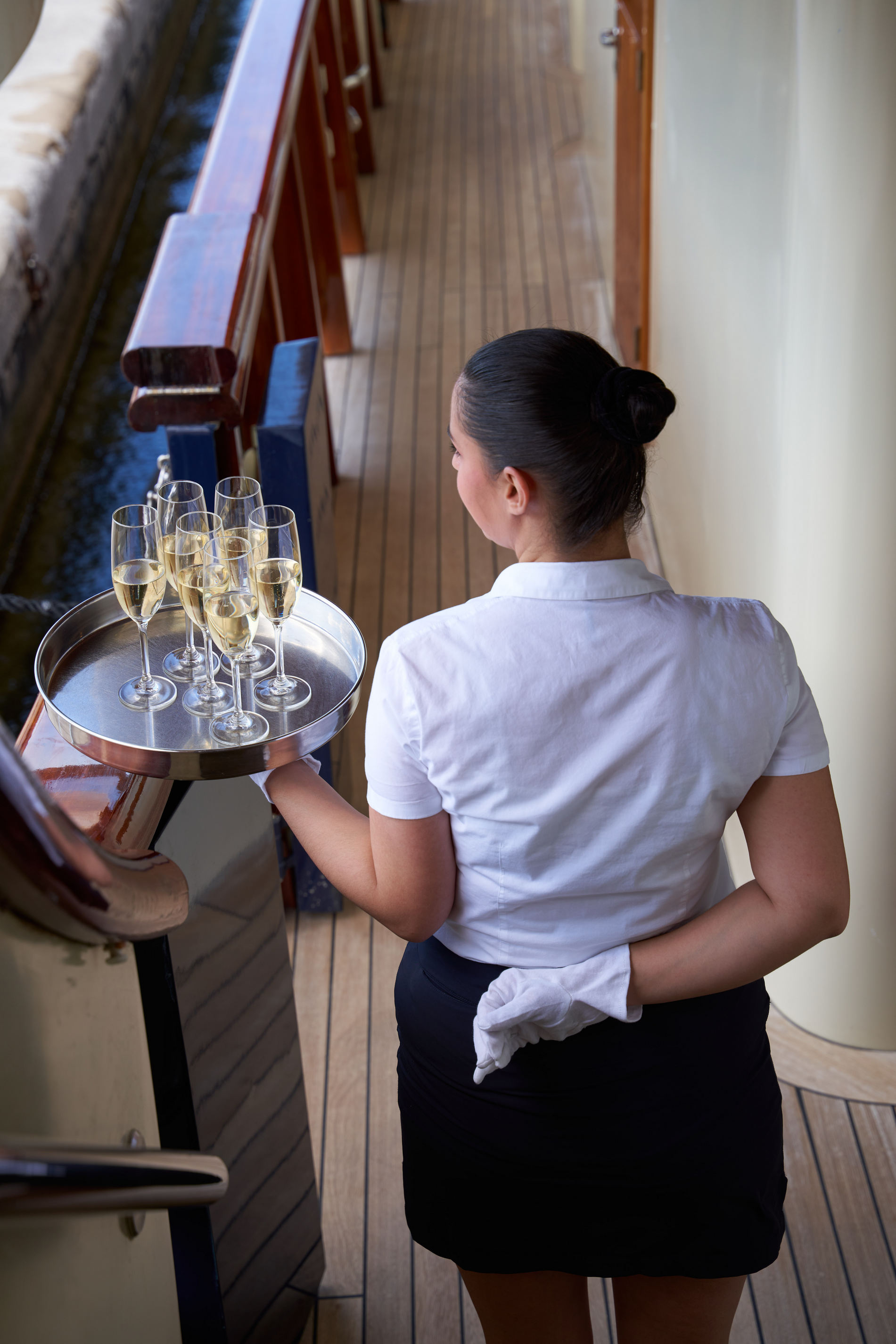 She is painted with a deep blue hull with yellow stripe and warm neutral superstructure creating an elegant and traditional aesthetic. Plenty of teak decking, handrails and window frames are immaculately maintained and set off beautifully with chrome details.