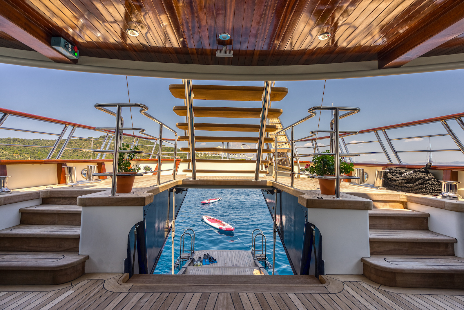 A circular jacuzzi is positioned aft surrounded by sun pads, while a covered area amidships is set up as a shaded lounge perfect for casual drinks and more sun loungers are forward. There is a gym zone enabling guests to exercise ...
