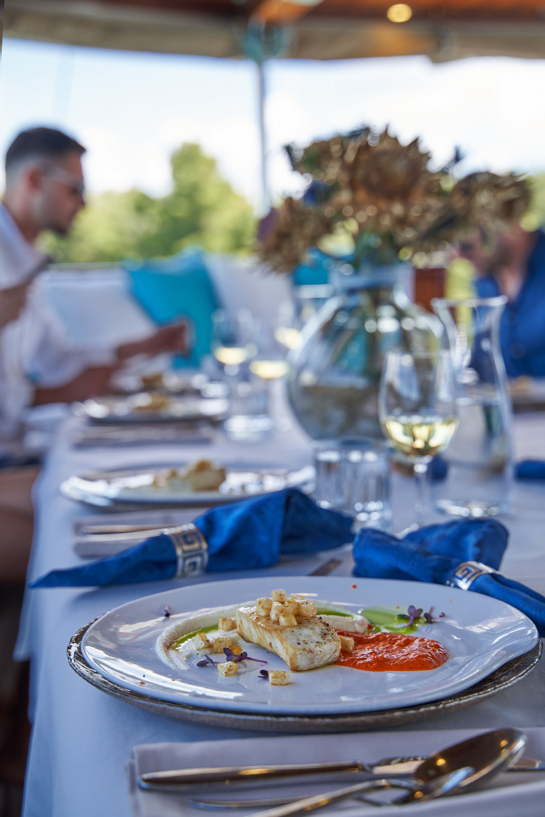 The upper deck aft is dedicated to al fresco dining with a selection of tables with cushioned bench seating and additional moveable chairs.