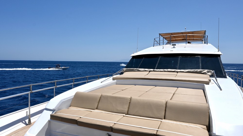 LADY MIRTO offers sociable deck spaces across the sun deck, foredeck with its generous cushioned sun pads and swim platform at the waters edge.