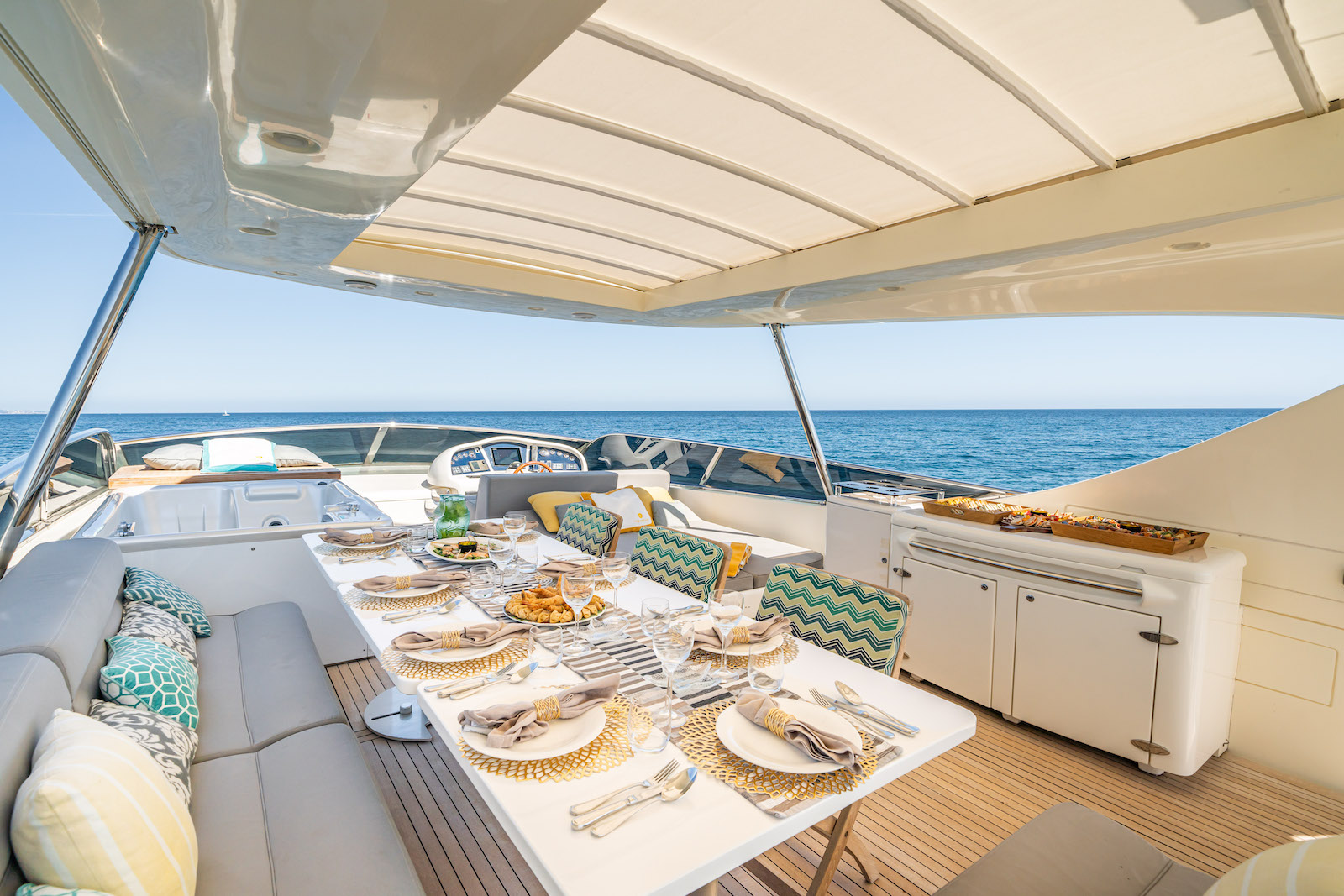 NOTABLE FEATURES OF FOURTEEN: ~Sociable flybridge with jacuzzi ~Contemporary deck furnishings ~Elegant ...