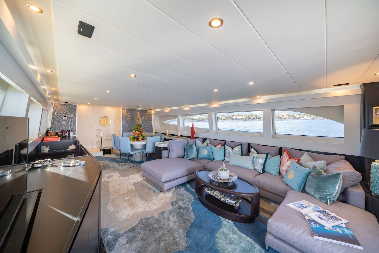 The main salon is configured with a lovely lounge space aft and oval dining table forward.