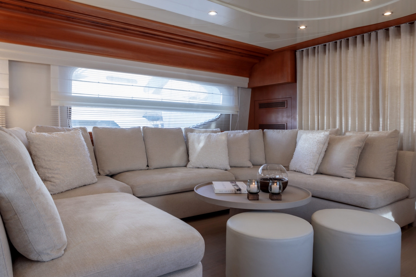The light and airy salon is a blend of warm wood details, pale wood flooring and neutral soft furnishings. There is a U-shaped sofa aft to starboard opposite fitted wooden cabinetry to port, while a dining setting is forward to starboard.
