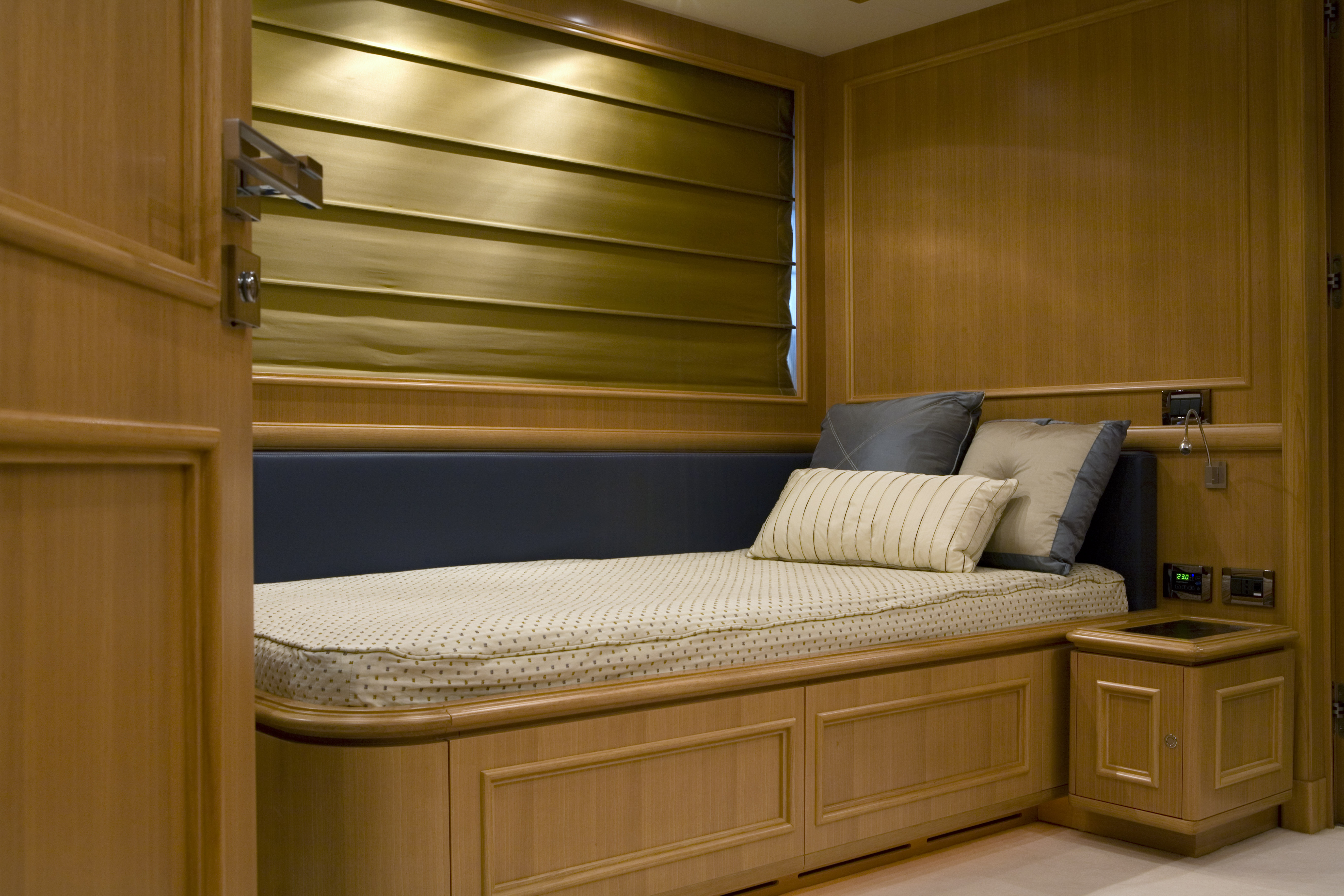 The yacht can accommodate up to 11 guests in five well-appointed deluxe cabins. The master suite spreads the entire width of the boat with a private terrace and spacious en suite bathroom. There are three additional double suites, each with a king size bed and one twin cabin with a pullman bunk.