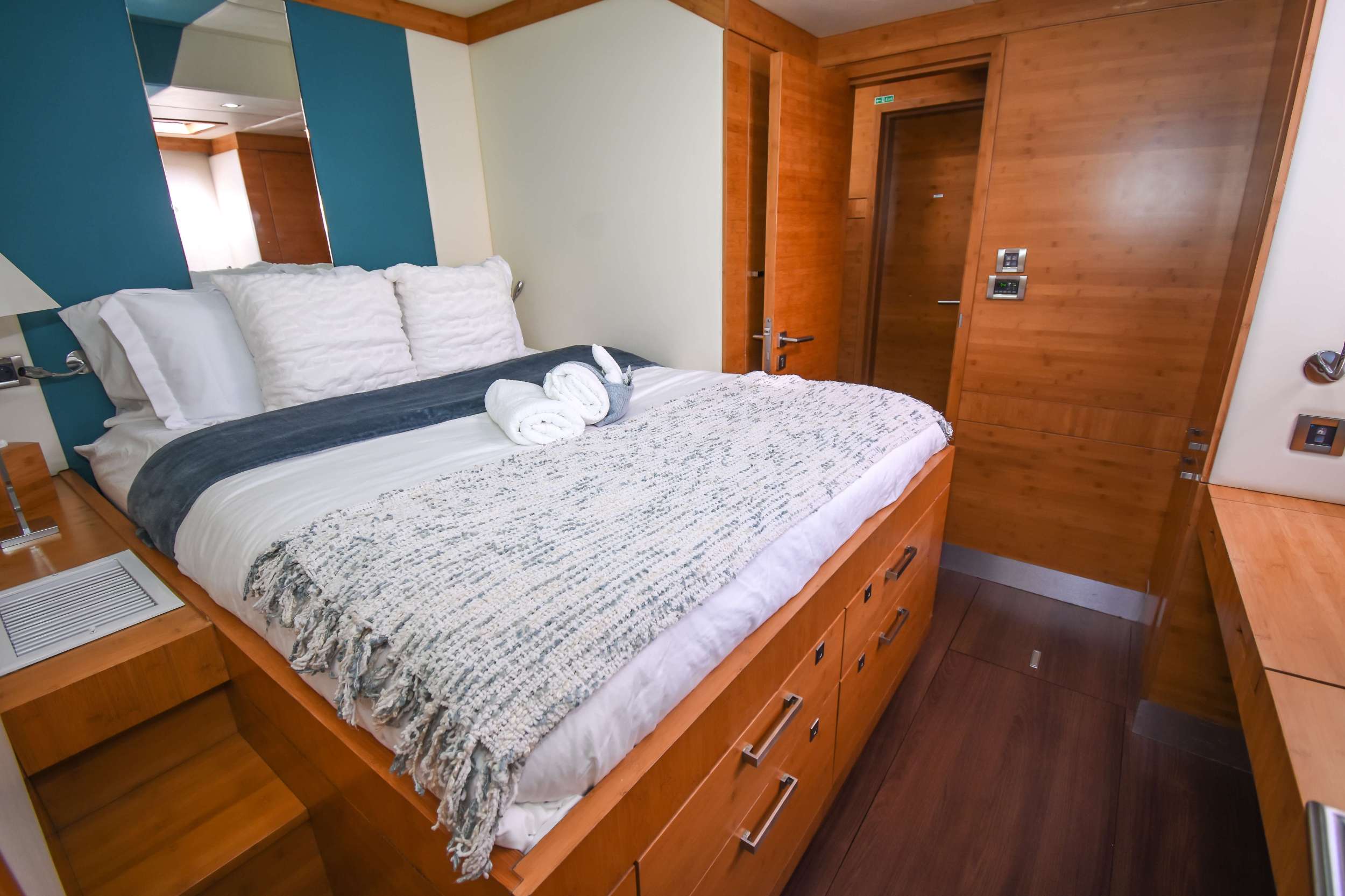 She boasts a striking exterior and light and welcoming interior with accommodation for up to eight guests in four spacious well-appointed ensuite cabins. A crew of two are on board throughout charter to ensure guests enjoy a fabulous experience.