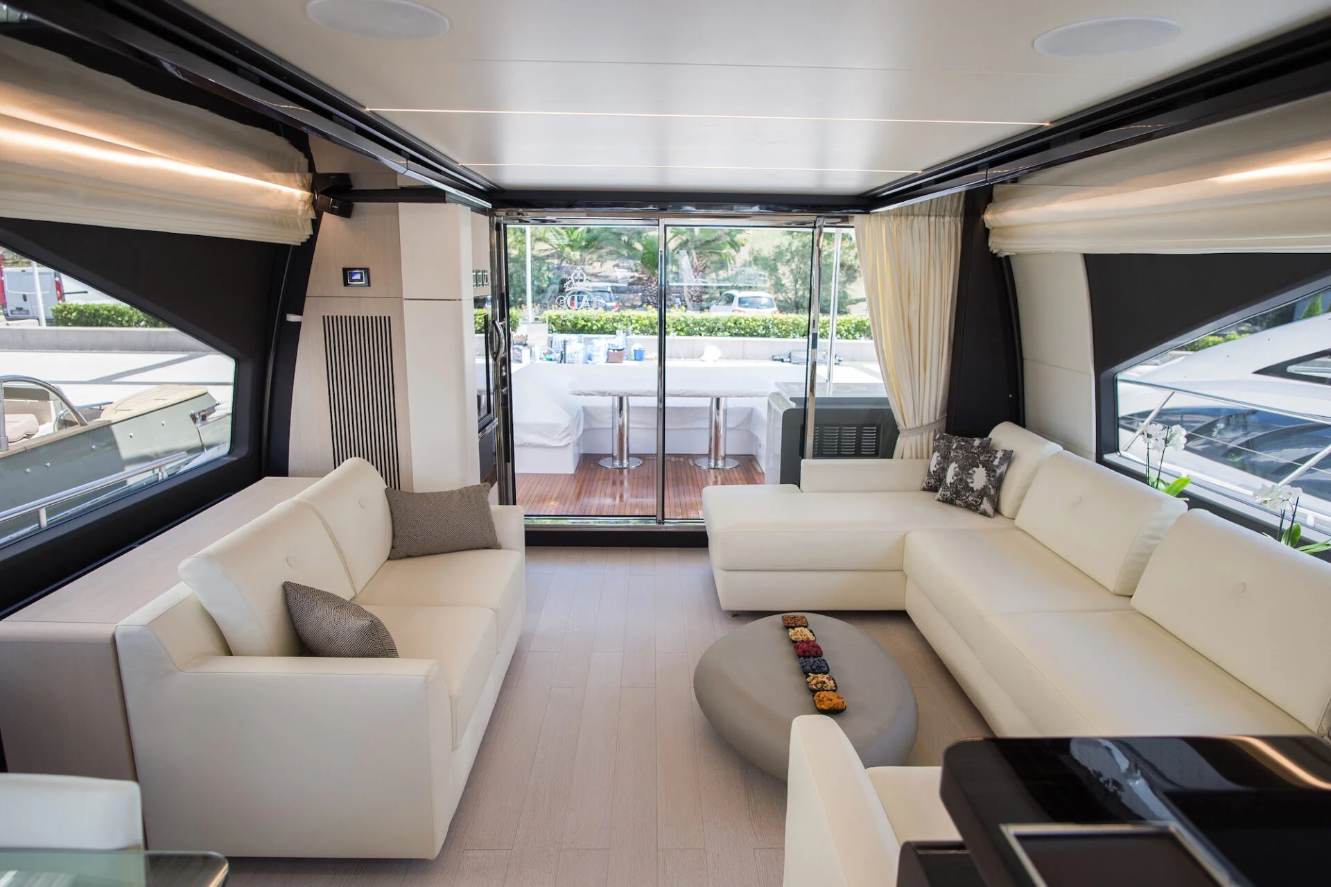 The main salon is light and bright and laid out to maximise the space for charter guests. The décor blends cream leather with light wood flooring and plenty of glass. There is an L-shaped sofa opposite a 2-seater sofa to aft, a dining table and open galley forward and the main helm controls further forward to starboard.