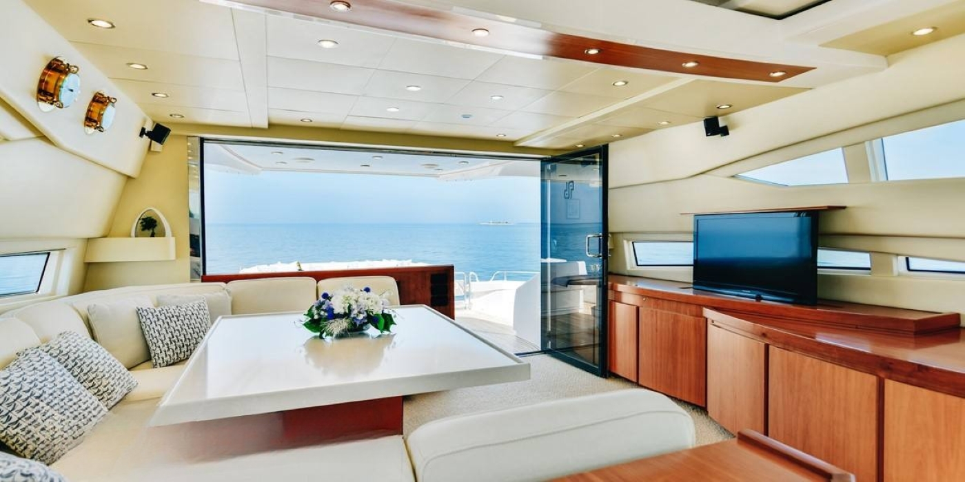 The bright and contemporary interior is decorated with neutral tones of cream with warm wood finishes which create a welcoming atmosphere. The main salon offers a large u-shaped sofa surrounding a flexible table so the space can be used as a lounge or dining room.
