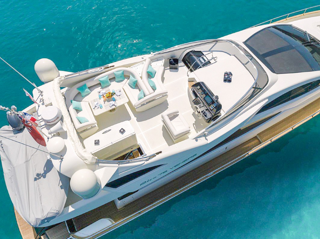 Above the main deck, the flybridge offers a further alfresco dining, additional seating and collapsible Bimini cover.