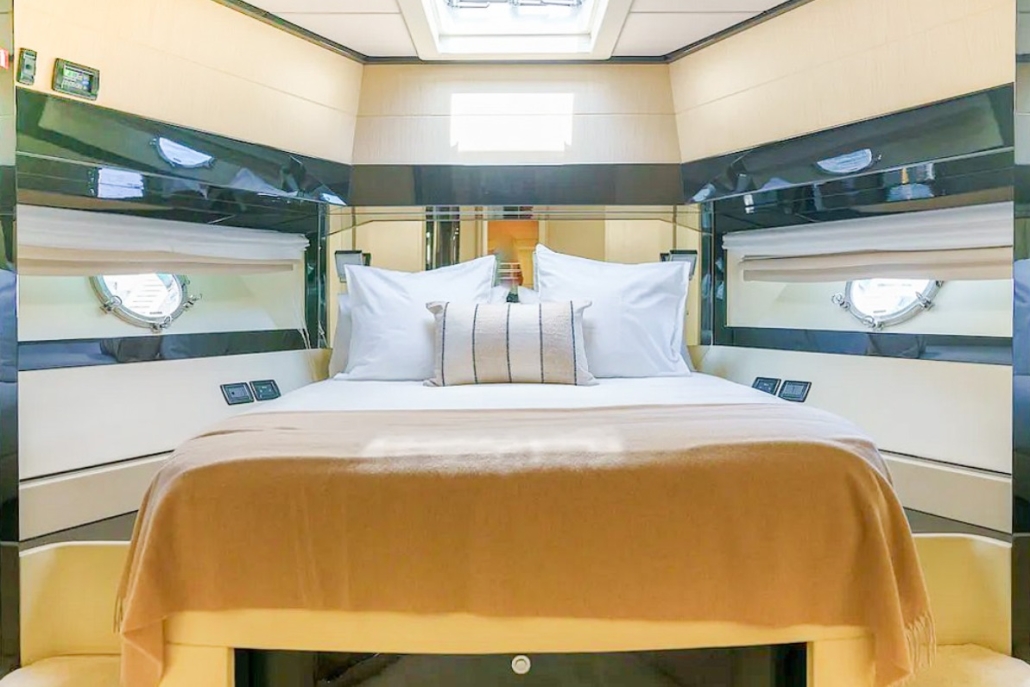 Sun lovers or romantic couples will enjoy the double sunpad on the foredeck, complete with fold-away Bimini cover, ideal for shade or privacy. Above the main deck, the flybridge offers a further alfresco dining, additional ...