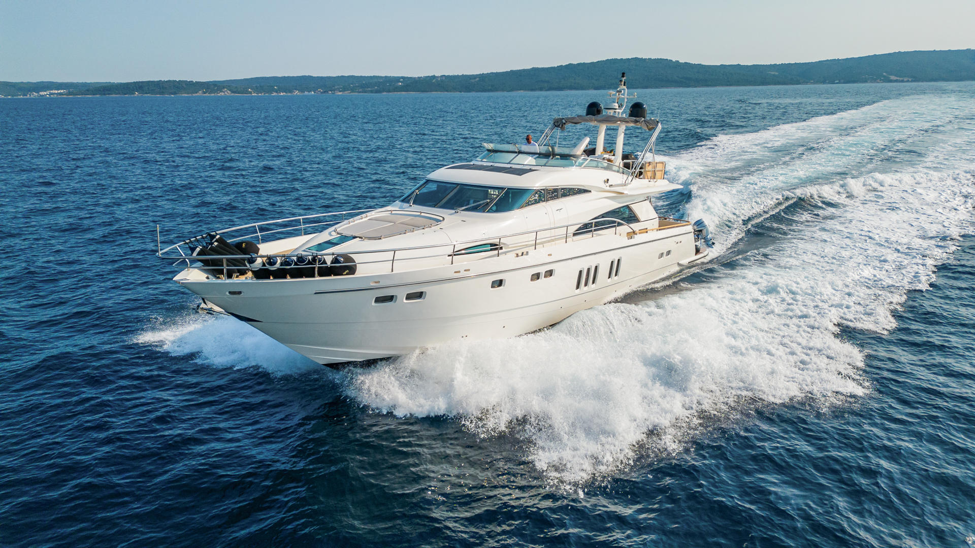 Motor yacht JOLIDOR is a 22.39 m (73' 5") Fairline Squadron 78, built in 2008 and refitted in 2023. As a flybridge yacht she offers plenty of deck space with choice of entertainment areas and can also accommodate up to eight guests in four suites. A crew of two are on board throughout the charter to assist the guests.
