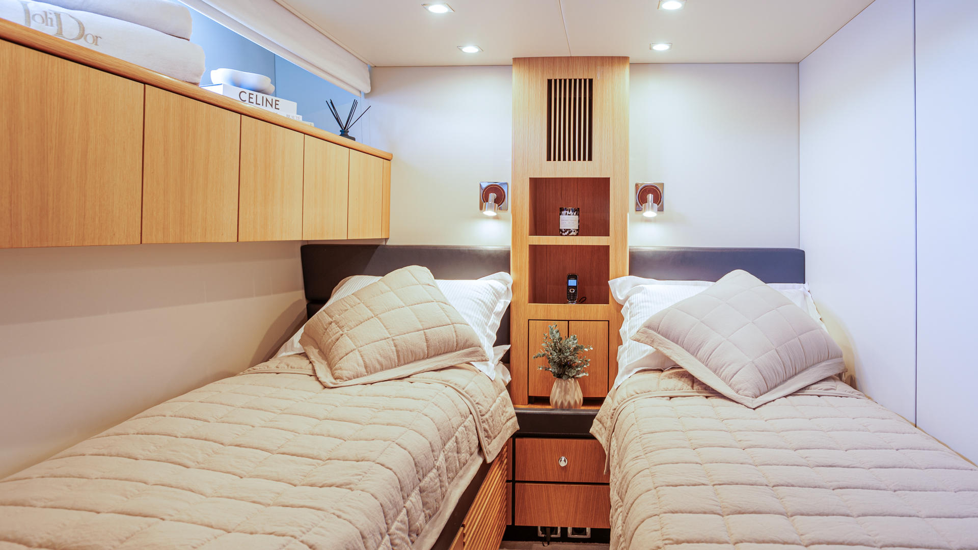 The cabins are configured as two double and two twins with additional, separate cabins for the crew. Tenders & Toys: