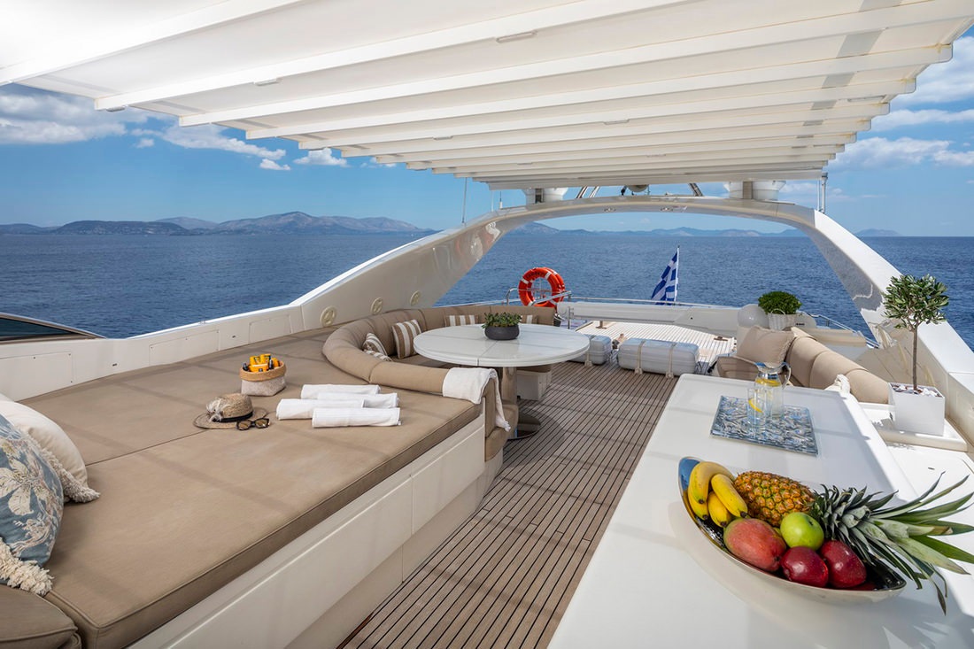 The main deck aft provides an alternative dining setting outside and is configured with a large u-shaped sofa and moveable chairs around a flexible table.