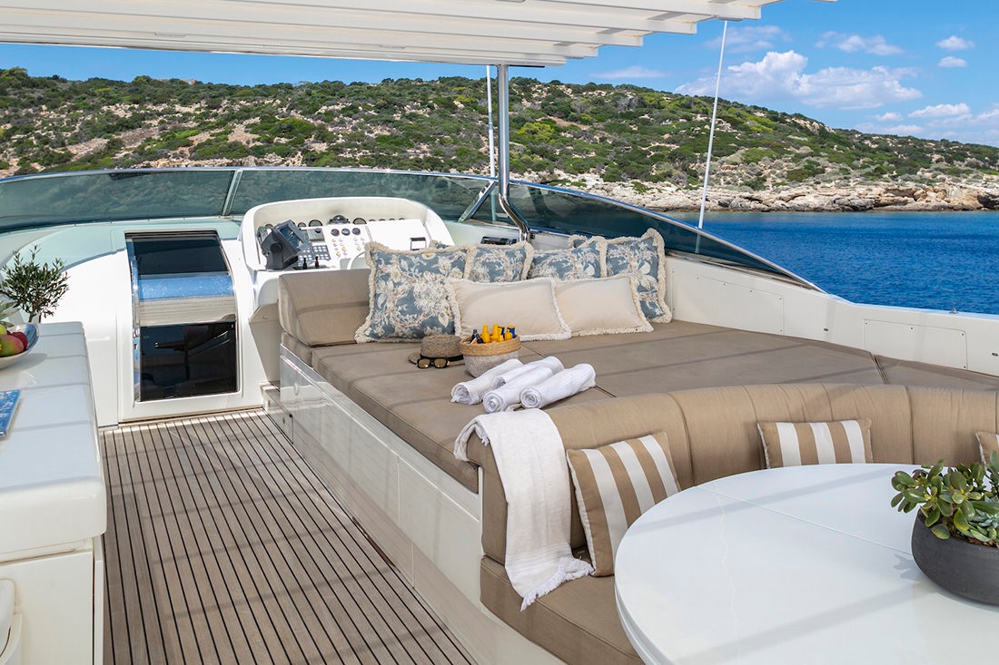 The main deck aft provides an alternative dining setting outside and is configured with a large u-shaped sofa and moveable chairs around a flexible table.
