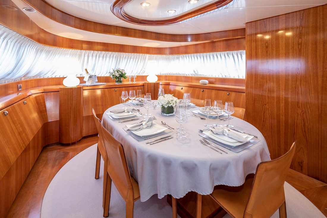 The flybridge has a sizeable retractable bimini allowing the elegant, curved dining setting to be shaded when it gets too hot. There are also a selection of sun pads up on the sun deck where guests can sit back and take in the views.