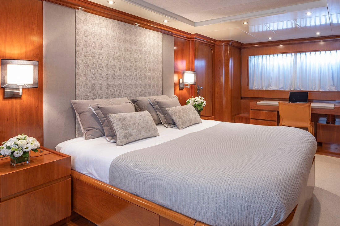 Her champagne-coloured hull gives her a unique profile and with four guest suites, she can accommodate up to 10 guests (8 + 2 pullman).