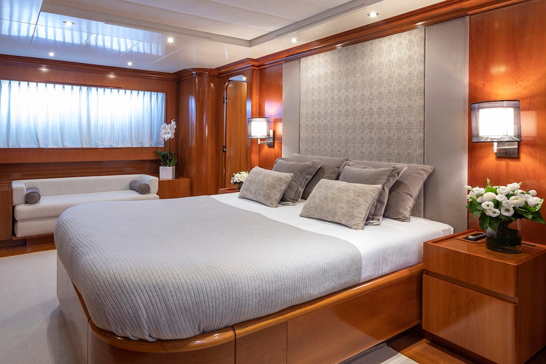 Her champagne-coloured hull gives her a unique profile and with four guest suites, she can accommodate up to 10 guests (8 + 2 pullman).