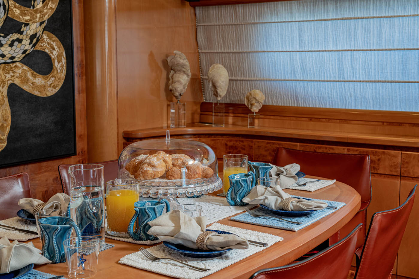 The main salon boasts access out onto the main deck aft and benefits from a flood of natural light. Configured with the lounge aft the dining area forward, there is plenty of welcoming space for guests to relax indoors. The galley and wheelhouse are forward, with the latter benefitting from a banquette seating areas.
