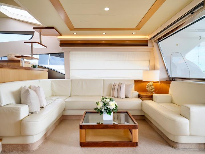 The natural sunlight which floods into the split-level main salon evokes feelings of peace and tranquillity allowing guests to fully relax in the aft lounge or savour dinner cooked on board around the forward dining table which is up a few gentle steps.