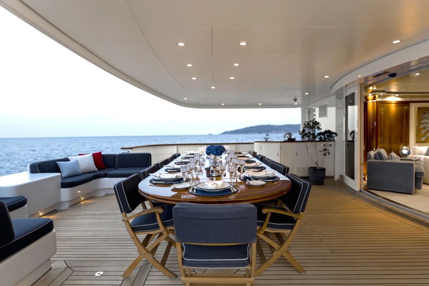 The main deck aft is perhaps best for larger evening dinners around the huge dining table which can seat everyone on board. The table is sheltered by the bridge deck overhang and there are sofas aft perfect for pre-dinner drinks ...