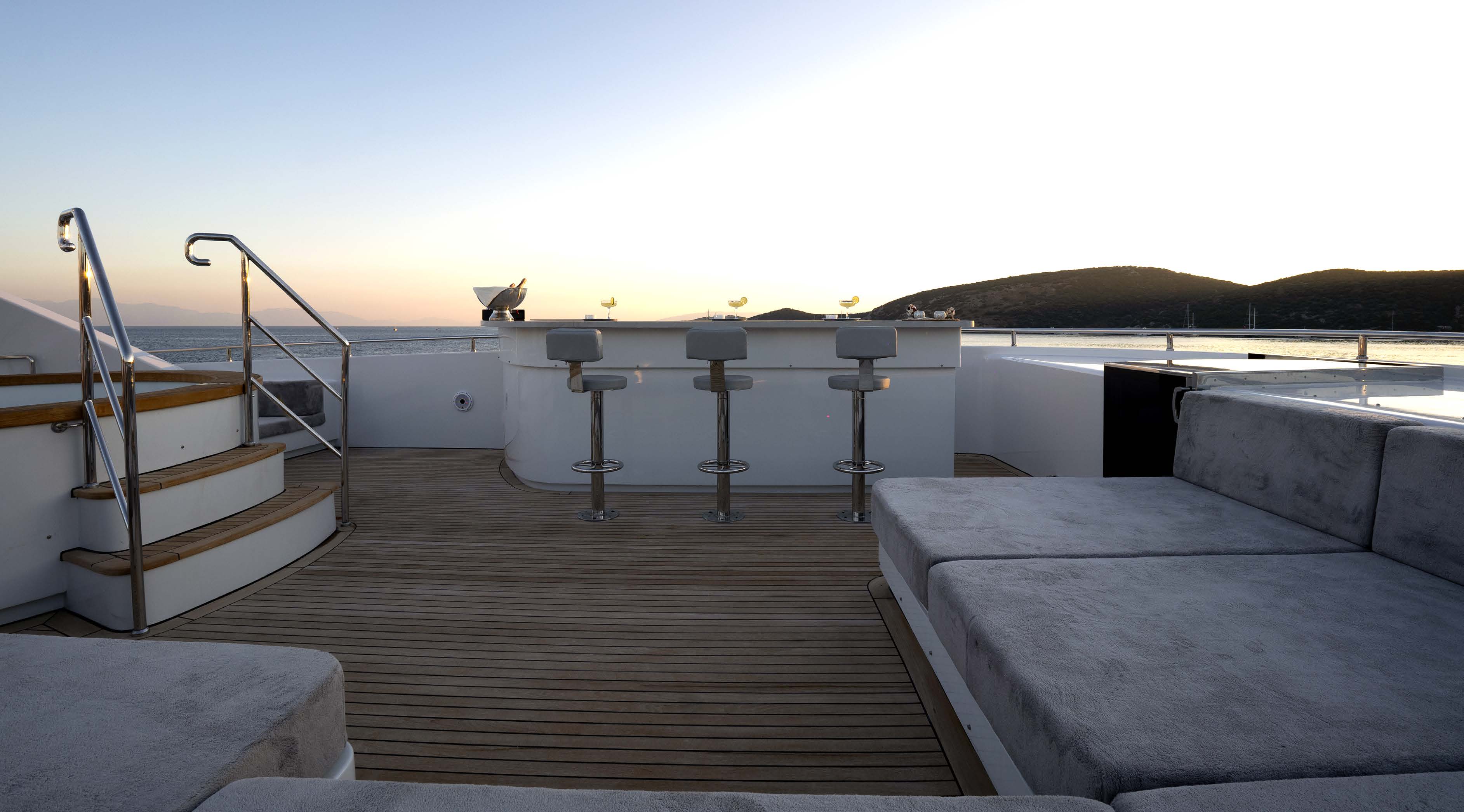 The open sun deck is perfect for lazy days in the sunshine, relaxing on the sun pads which surround the jacuzzi, savouring a casual meal at the dining setting or sipping a cocktail at the sit up bar.