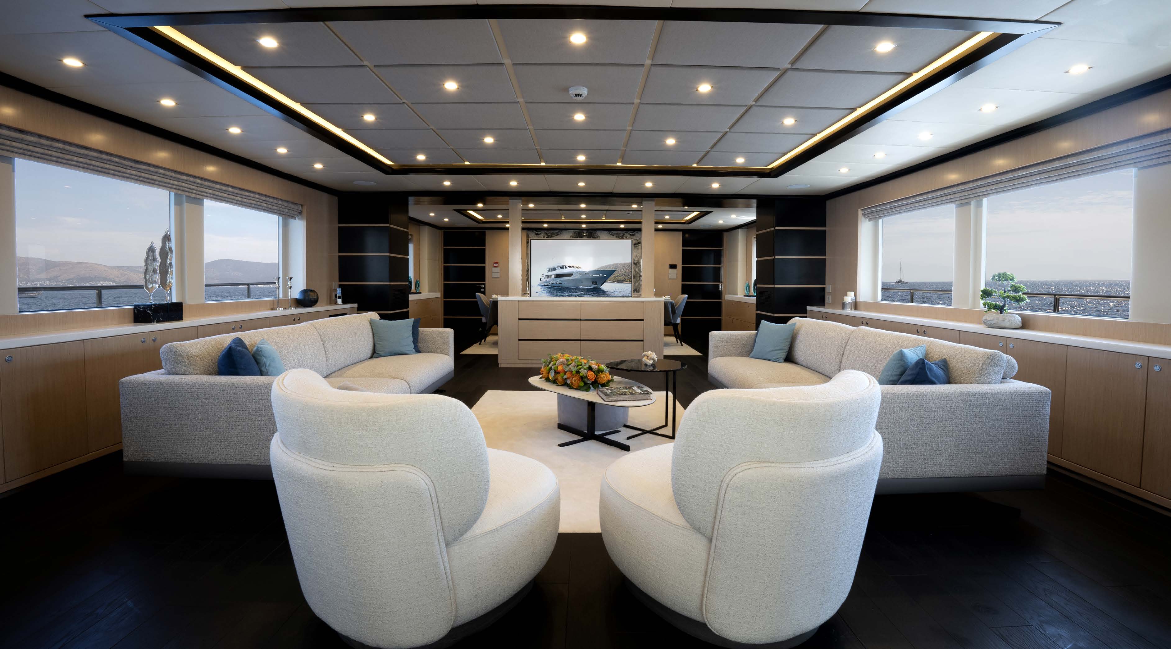 The main salon on the main deck is light and bright thanks to the large windows and contemporary furnishings and finishings. The space is generous and offers an aft lounge and forward dining room semi divided by built in cabinetry.