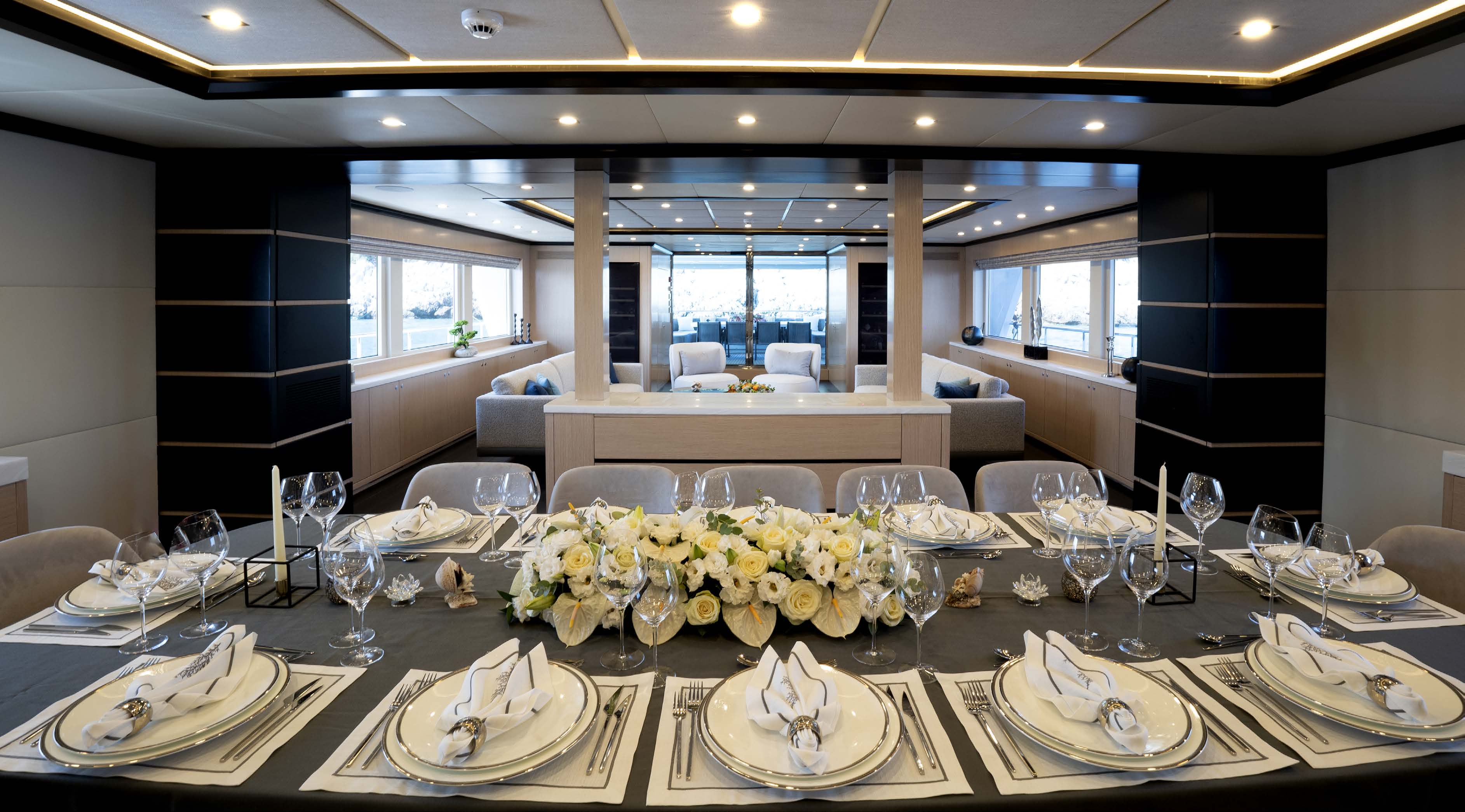 The main salon on the main deck is light and bright thanks to the large windows and contemporary furnishings and finishings. The space is generous and offers an aft lounge and forward dining room semi divided by built in cabinetry.