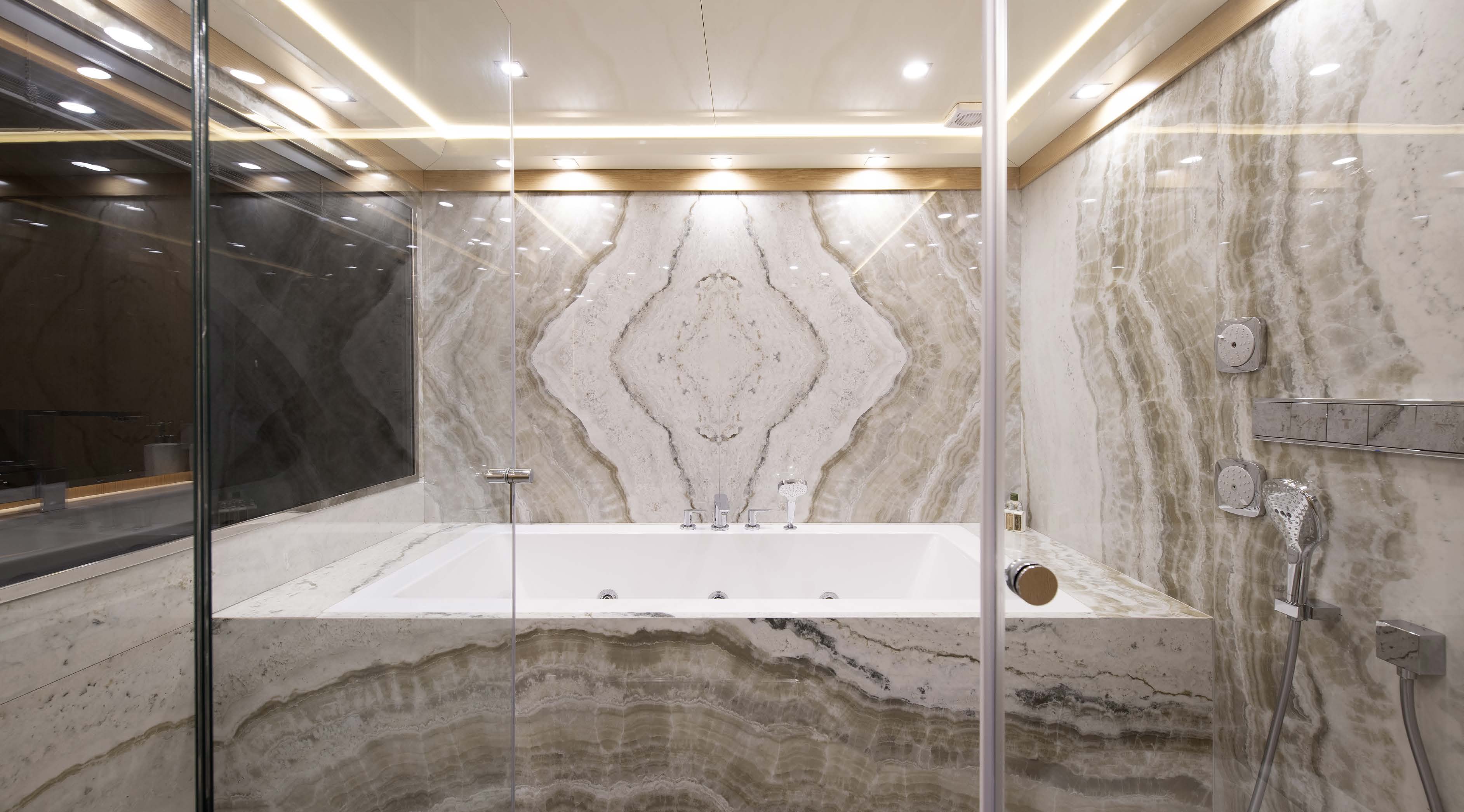 The wonderful owner’s suite on the upper deck offers complete privacy for primary charter guests with a huge bed, walk in wardrobe and ensuite bathroom and enjoys a private aft terrace with jacuzzi.