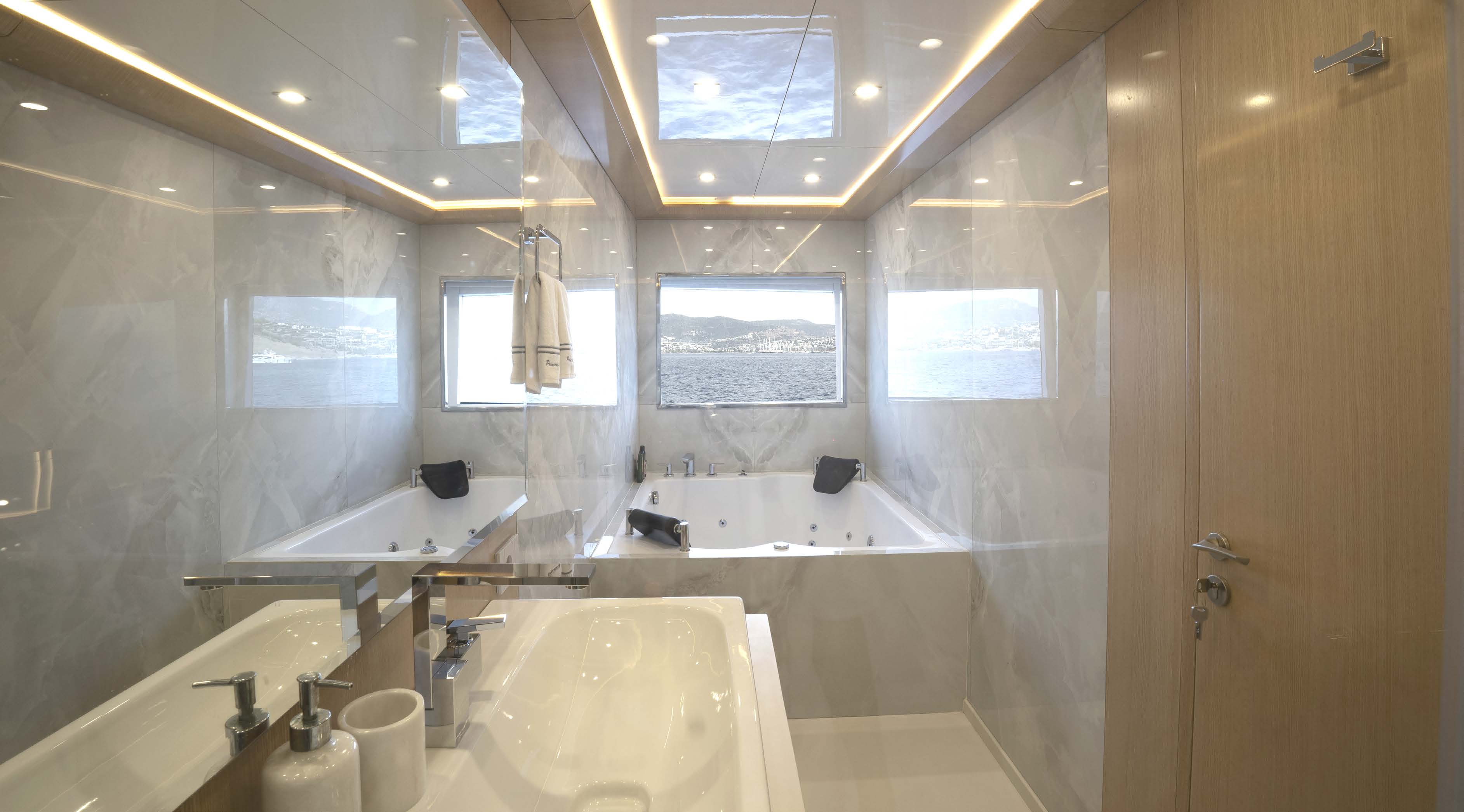 The wonderful owner’s suite on the upper deck offers complete privacy for primary charter guests with a huge bed, walk in wardrobe and ensuite bathroom and enjoys a private aft terrace with jacuzzi.