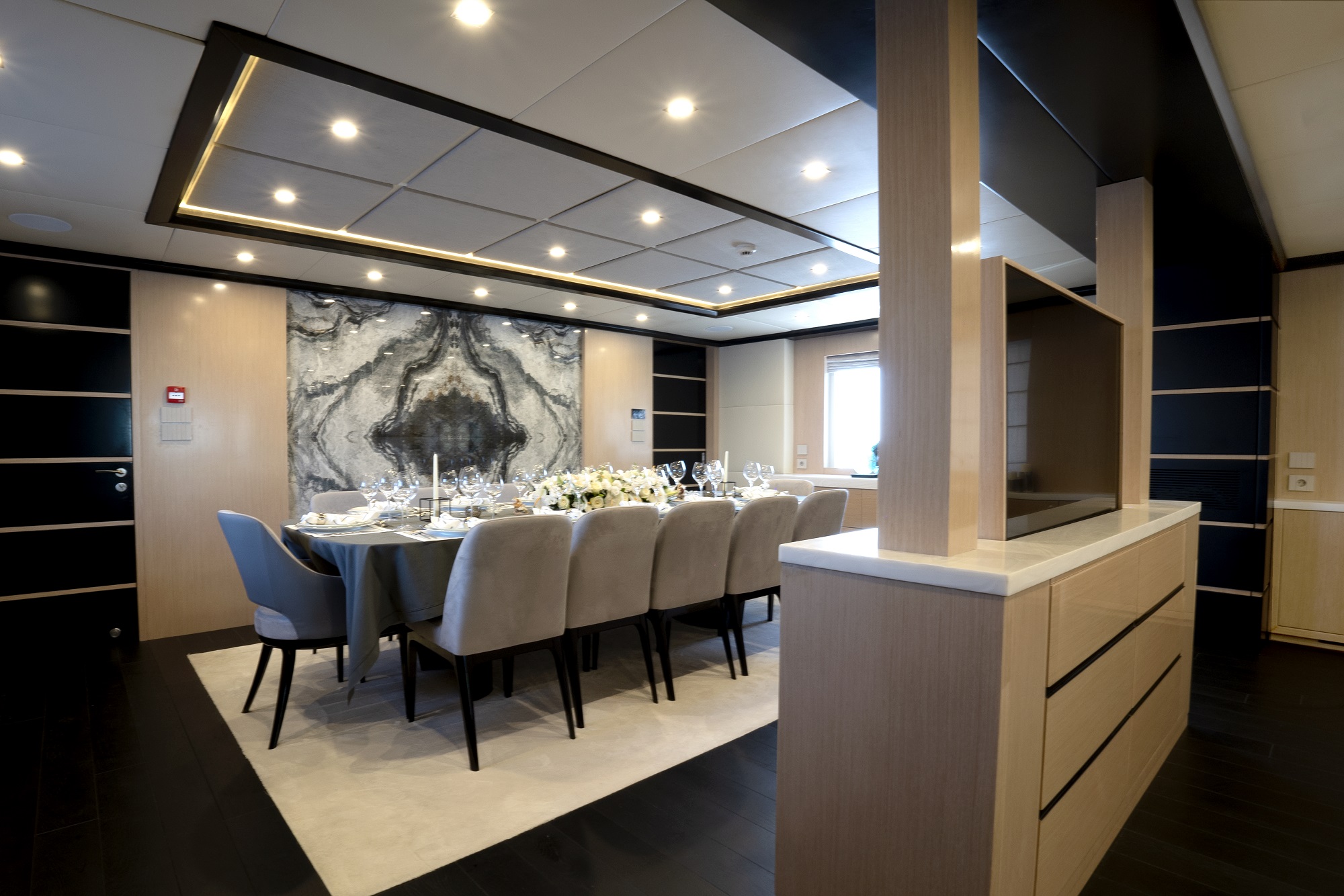 The main salon on the main deck is light and bright thanks to the large windows and contemporary furnishings and finishings. The space is generous and offers an aft lounge and forward dining room semi divided by built in cabinetry.