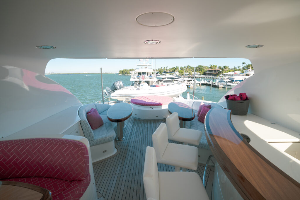 This 2007 Lazarra motor yacht has a lovely, elegant profile and deck furnishings finished with feminine shades.