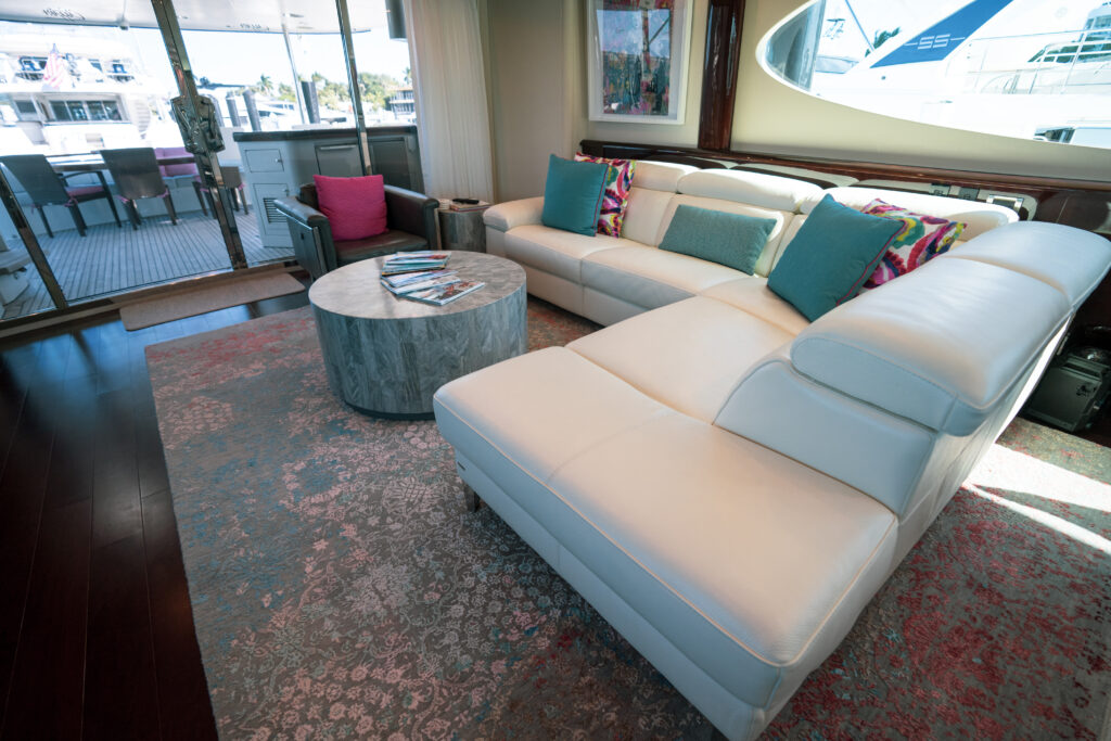 The main salon is light, bright and elegantly furnished with a large L-shaped sofa aft, small round glass breakfast/card table and a larger dining table forward. Forward on the main deck is a wonderfully light and welcoming dine in galley perfect for breakfast or kid’s meals.