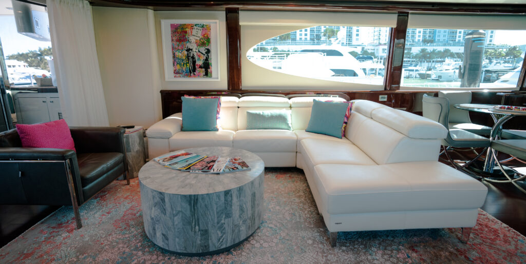 The main salon is light, bright and elegantly furnished with a large L-shaped sofa aft, small round glass breakfast/card table and a larger dining table forward. Forward on the main deck is a wonderfully light and welcoming dine in galley perfect for breakfast or kid’s meals.