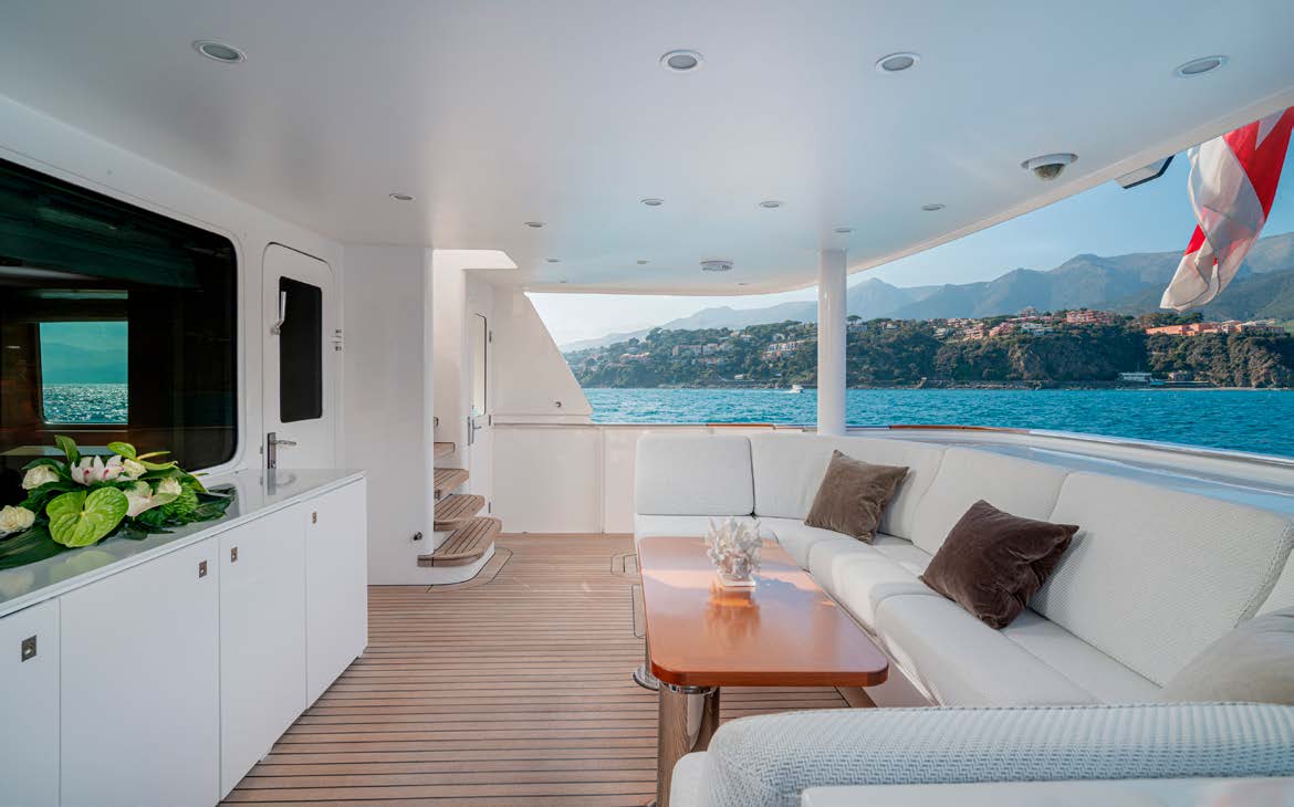 ATOM'S external areas are equally impressive and include her main deck aft with protected dining for 10 (a favourite for breakfast service), and her sundeck which is accessed from an external staircase leading up from the boat deck. The sundeck boasts a 6 personal Spa Pool surrounded by large sun beds and lounge chairs.