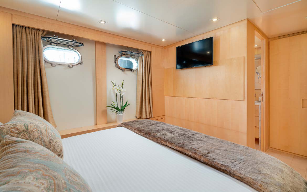 She has a simple and contemporary interior design, featuring clean lines by her interior designer Michael Kirschstein and her naval architecture was done by Bray Yacht. She is able to accommodate up to 9 charter guests in 4 cabins.