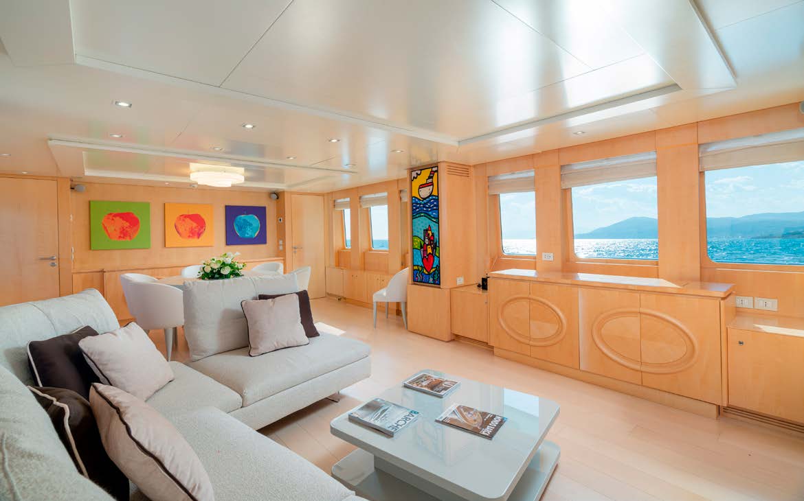 ATOM'S external areas are equally impressive and include her main deck aft with protected dining for 10 (a favourite for breakfast service), and her sundeck which is accessed from an external staircase leading up from the boat deck. The sundeck boasts a 6 personal Spa Pool surrounded by large sun beds and lounge chairs.