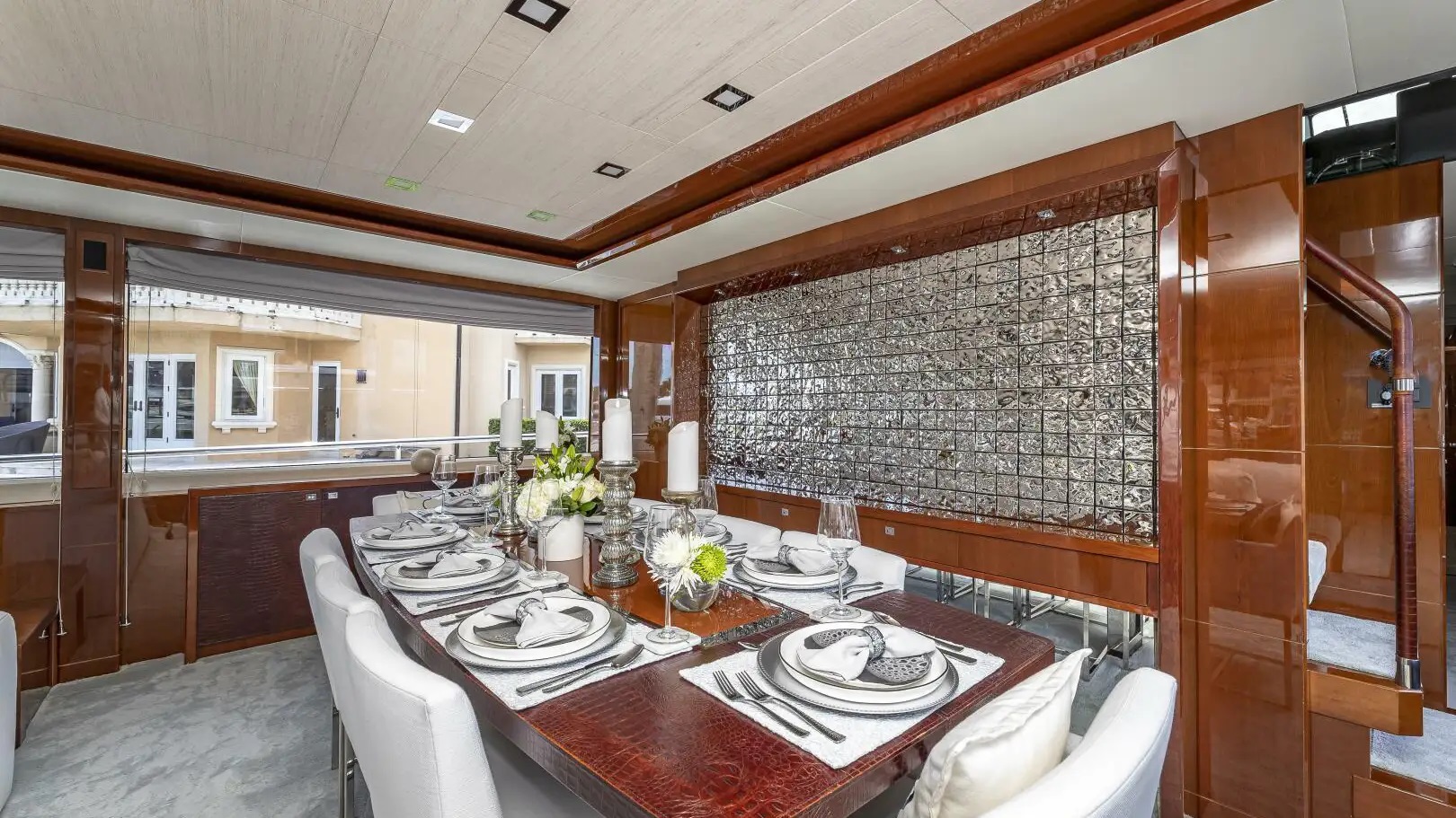 Under the hard roof there is a u-shaped dining setting to port and wet bar to starboard while the 4-seater helm station is forward. The roof has a retractable section to allow the sunshine to flood in if guests prefer.